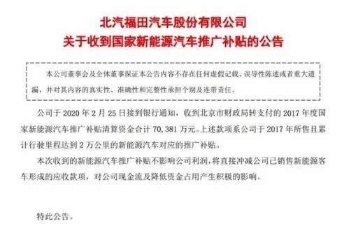 福田汽車:收到7億元國(guó)家新能源汽車推廣補(bǔ)貼