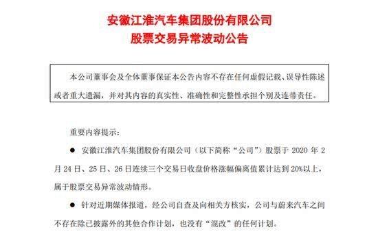 江淮汽車今日發(fā)布公告稱:針對(duì)近期媒體報(bào)道,經(jīng)公司自查及向相關(guān)方核實(shí),公司與蔚來(lái)汽車之間不存在除已披露外的其他合作計(jì)劃,也沒(méi)有“混改”的任何計(jì)劃。